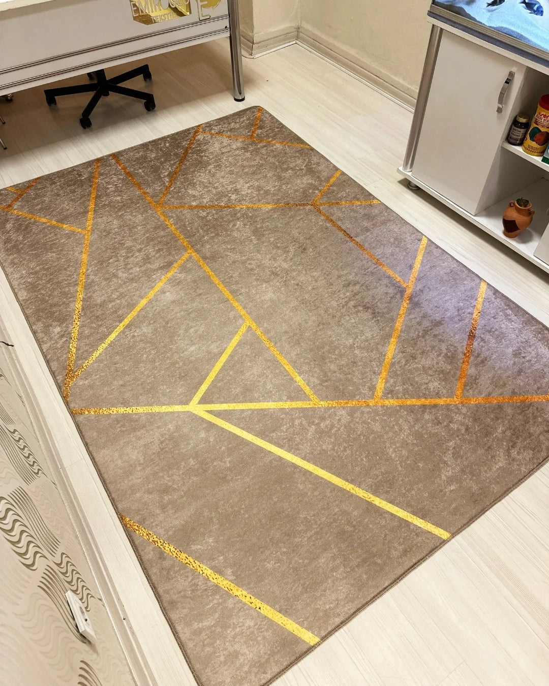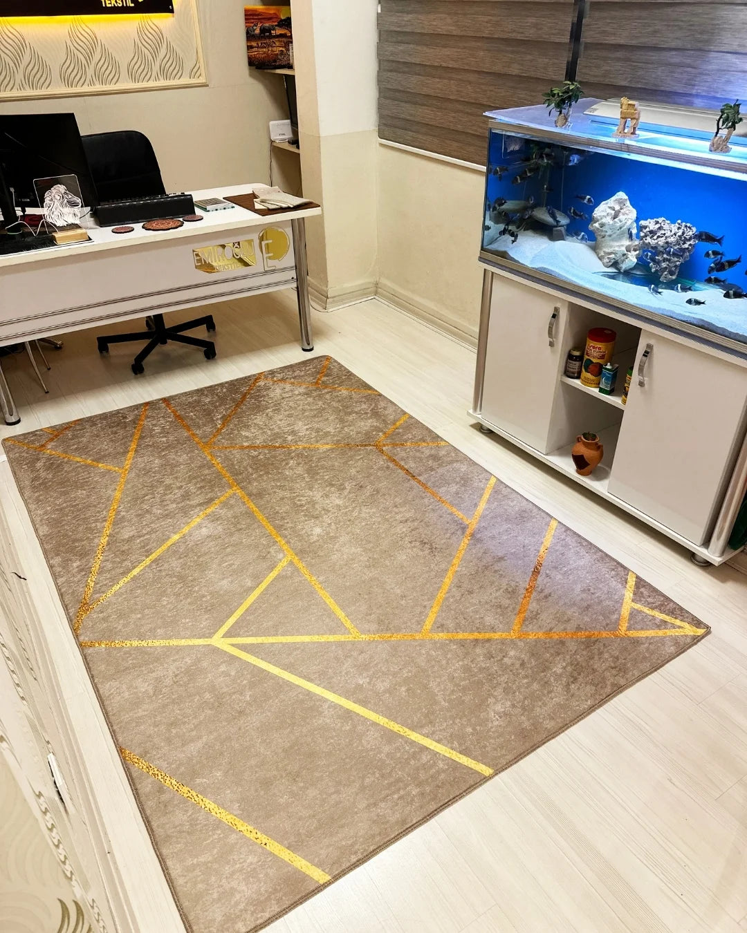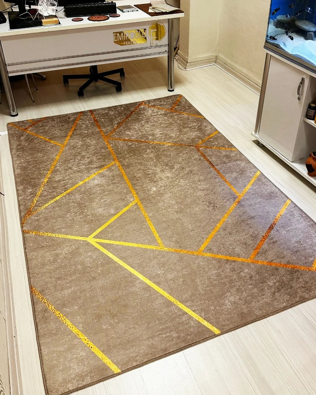 Kahverengi zemin üzerine gold şerit detayıyla tasarlanan bu özel halı, ev dekorasyonuna lüks ve modern bir dokunuş katar. Zarif renk uyumu sayesinde hem klasik hem çağdaş yaşam alanlarına kolayca uyum sağlar.
