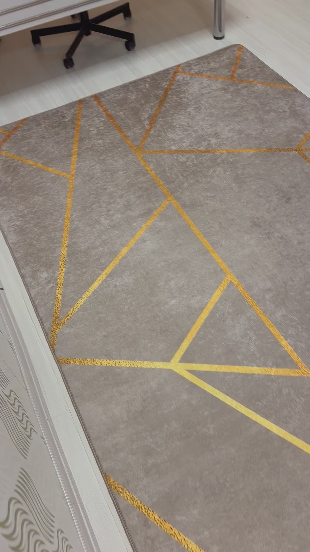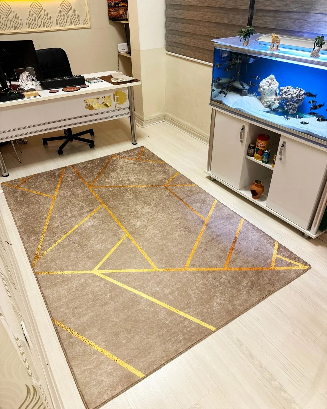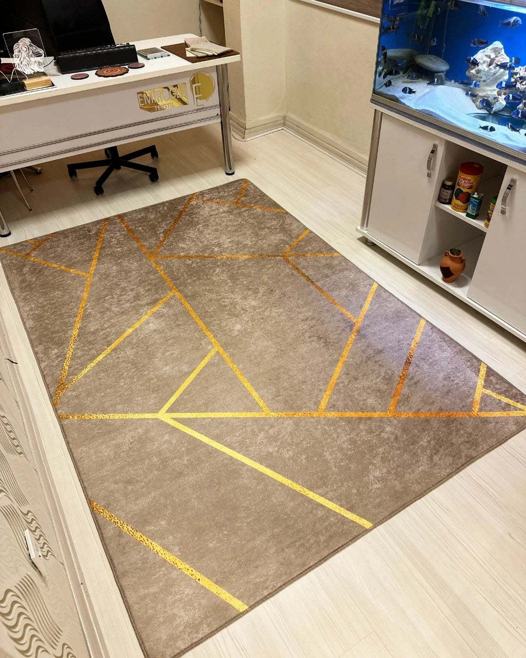 Kahverengi zemin üzerine gold şerit detayıyla tasarlanan bu özel halı, ev dekorasyonuna lüks ve modern bir dokunuş katar. Zarif renk uyumu sayesinde hem klasik hem çağdaş yaşam alanlarına kolayca uyum sağlar.