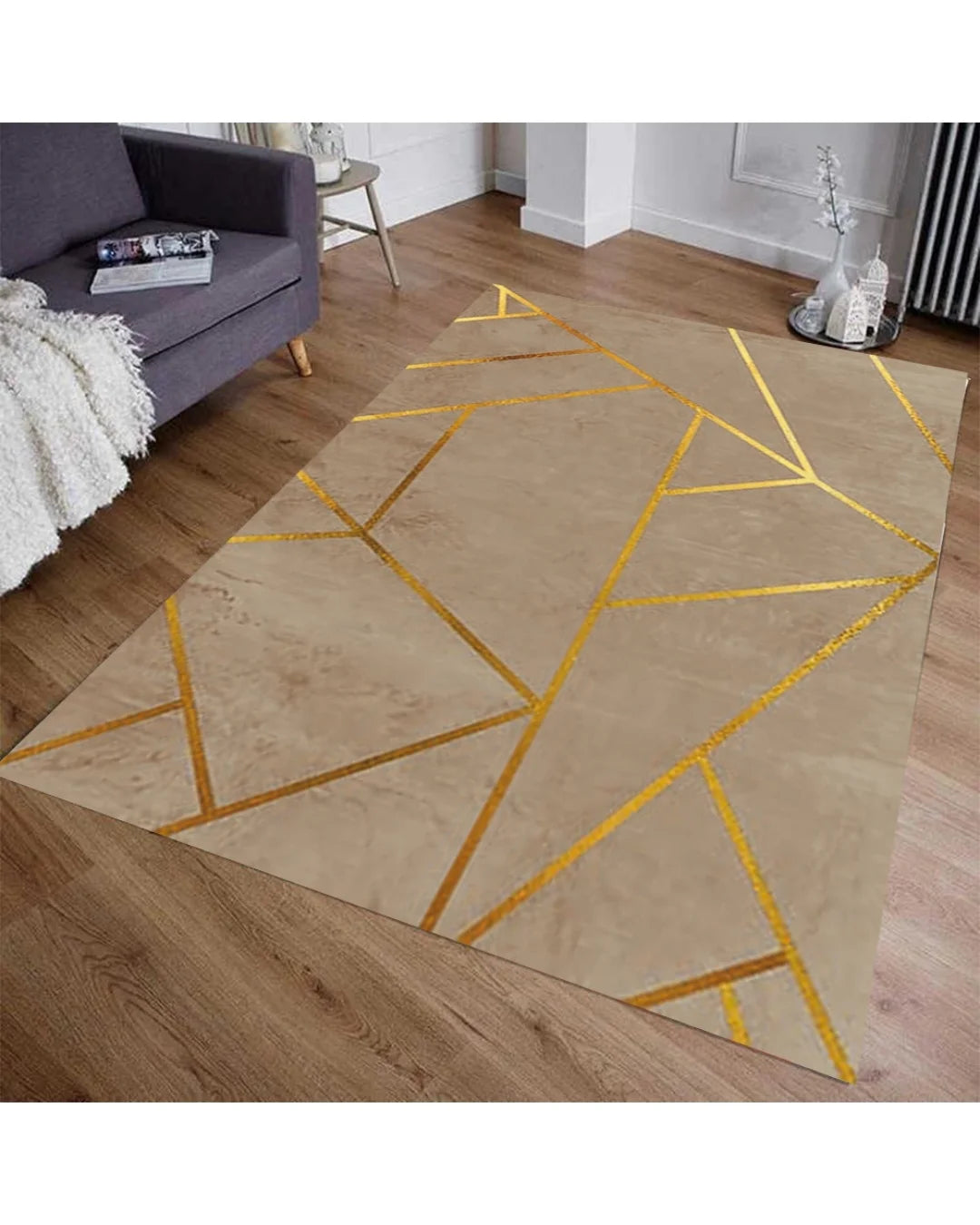 Kahverengi zemin gold şeritli yıkanabilir halı, konfor ve estetiği bir araya getiren ideal bir dekorasyon parçasıdır.
