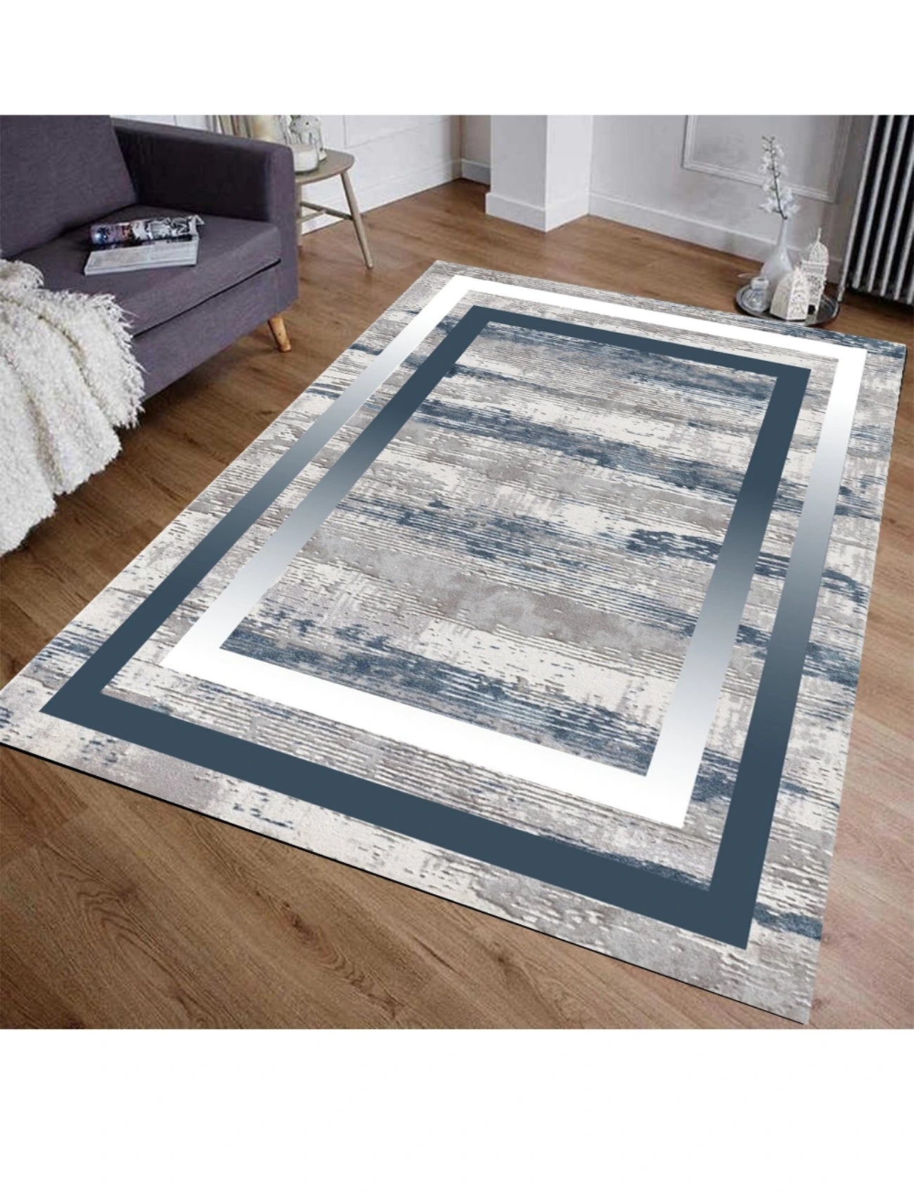 Modern gri zemin üzerine mavi dikdörtgen desenleri ile tasarlanan bu halı, yaşam alanlarınıza hem sade hem modern bir estetik katar. Geometrik tasarımı sayesinde dekorasyonunuzu tamamlar ve odanıza derinlik hissi verir.